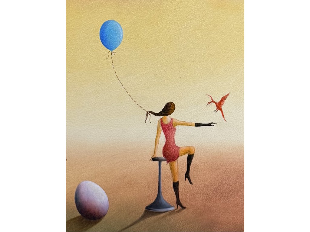 Typický surrealistický olej od Pavla Pardyho, vyznačující se snovou atmosférou, symbolikou a abstrakcí. Rozměr oleje s názvem Ptačí žena je 41 x 51 cm, signováno vpravo dole, rámováno v typickém Pardyho rámu.